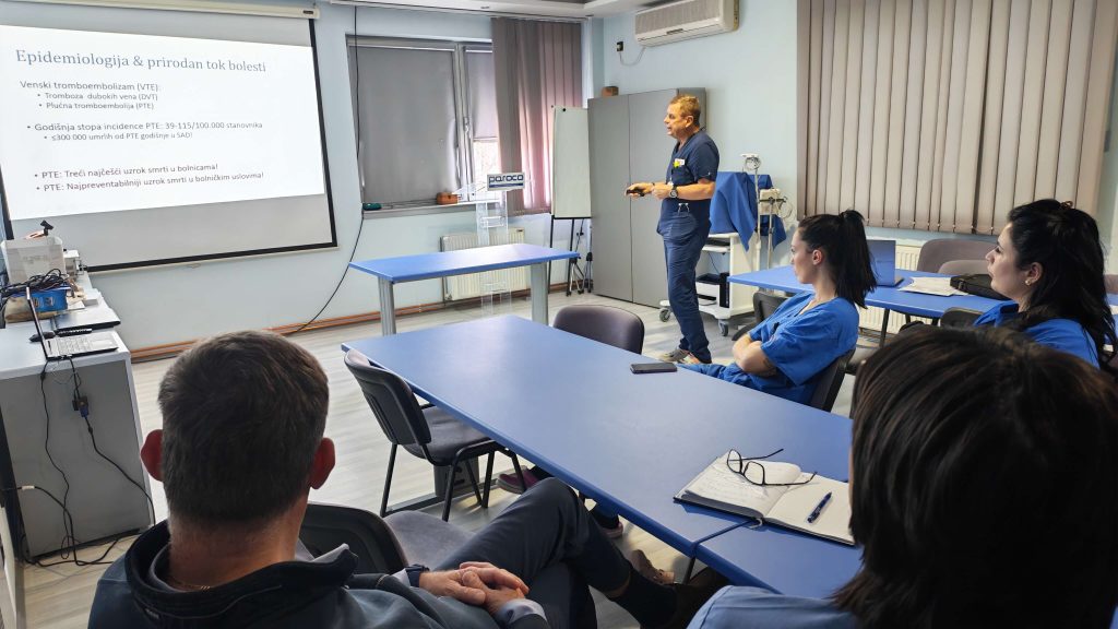 Ova edukacija deo je kontinuirane obuke zaposlenih u našoj bolnici, sa ciljem povećanja stručnosti, unapređenja kvaliteta rada i profesionalnog razvoja medicinskog osoblja. Kroz predavanje, naši lekari i medicinske sestre imali su priliku da prodube znanja o ranoj dijagnostici i inicijalnom tretmanu plućne tromboembolije, što direktno doprinosi sigurnosti i boljoj nezi naših pacijenata.
